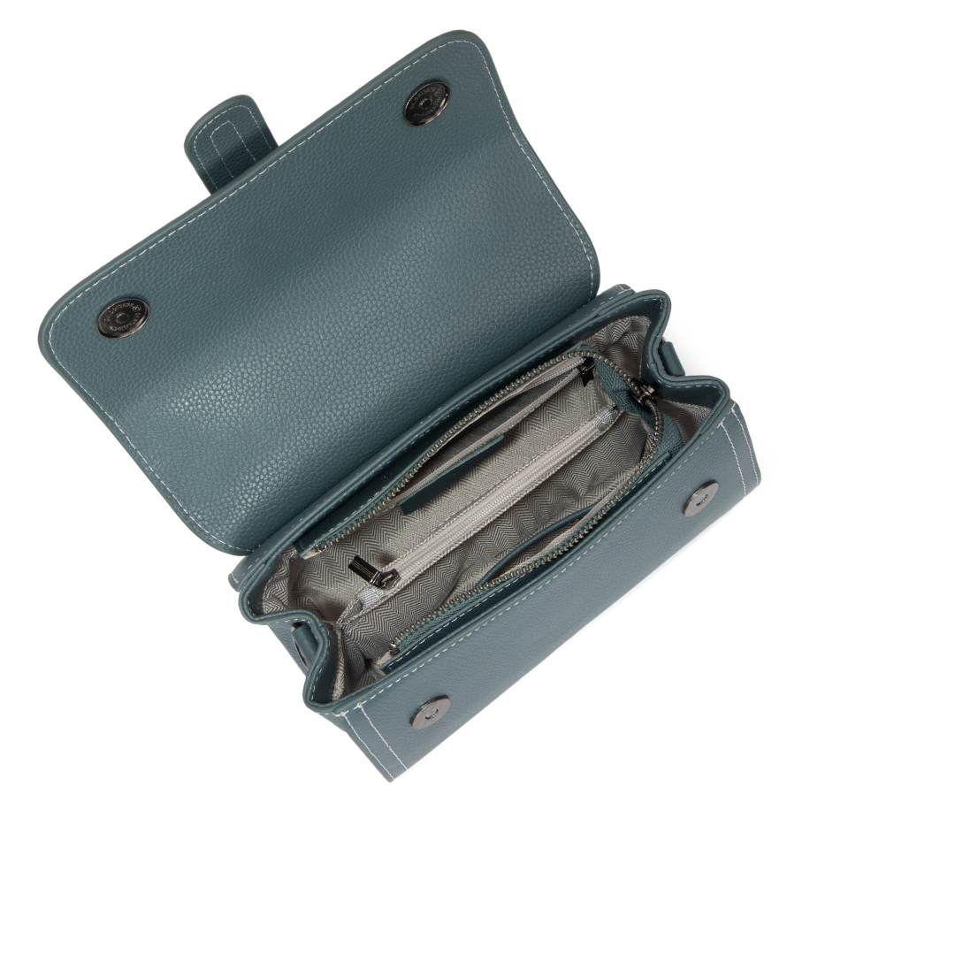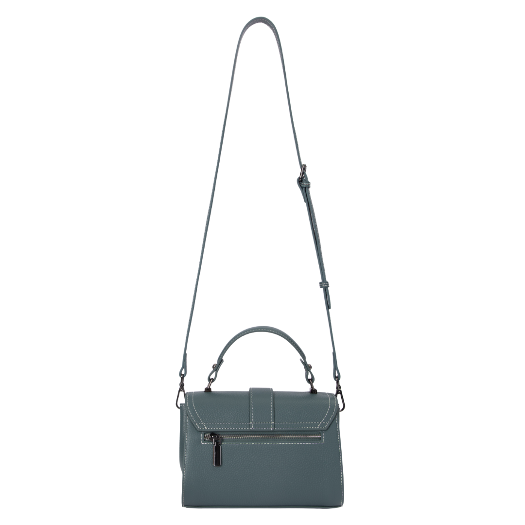 - Closure: Front flap with metal bar and back exterior zip pocket.