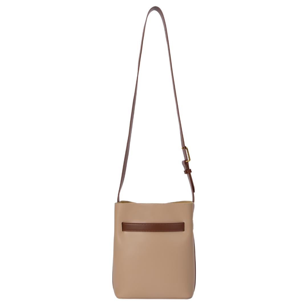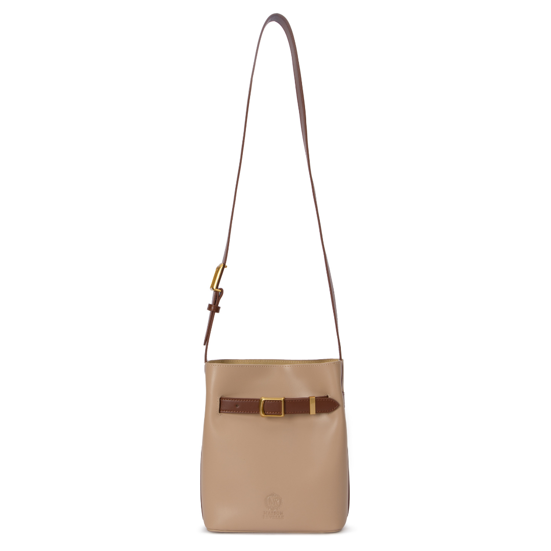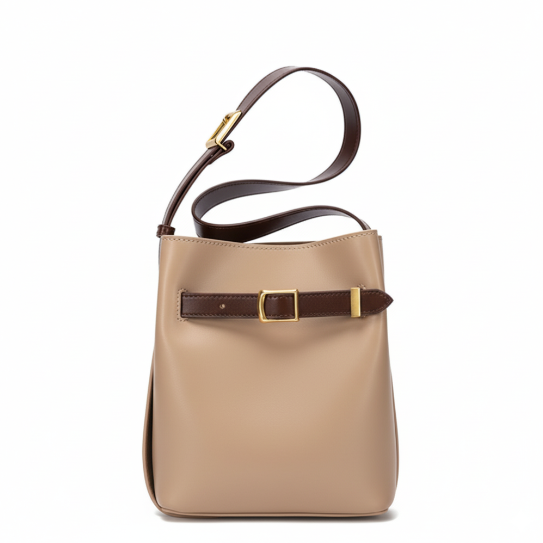 Sophistication in contrast. This sculptural bucket bag is a study in refined design, pairing premium dark beige split leather with a distinctive chocolate brown belt detail. Accented by polished gold-tone hardware, its quietly commanding silhouette is built for the woman who wears elegance effortlessly.