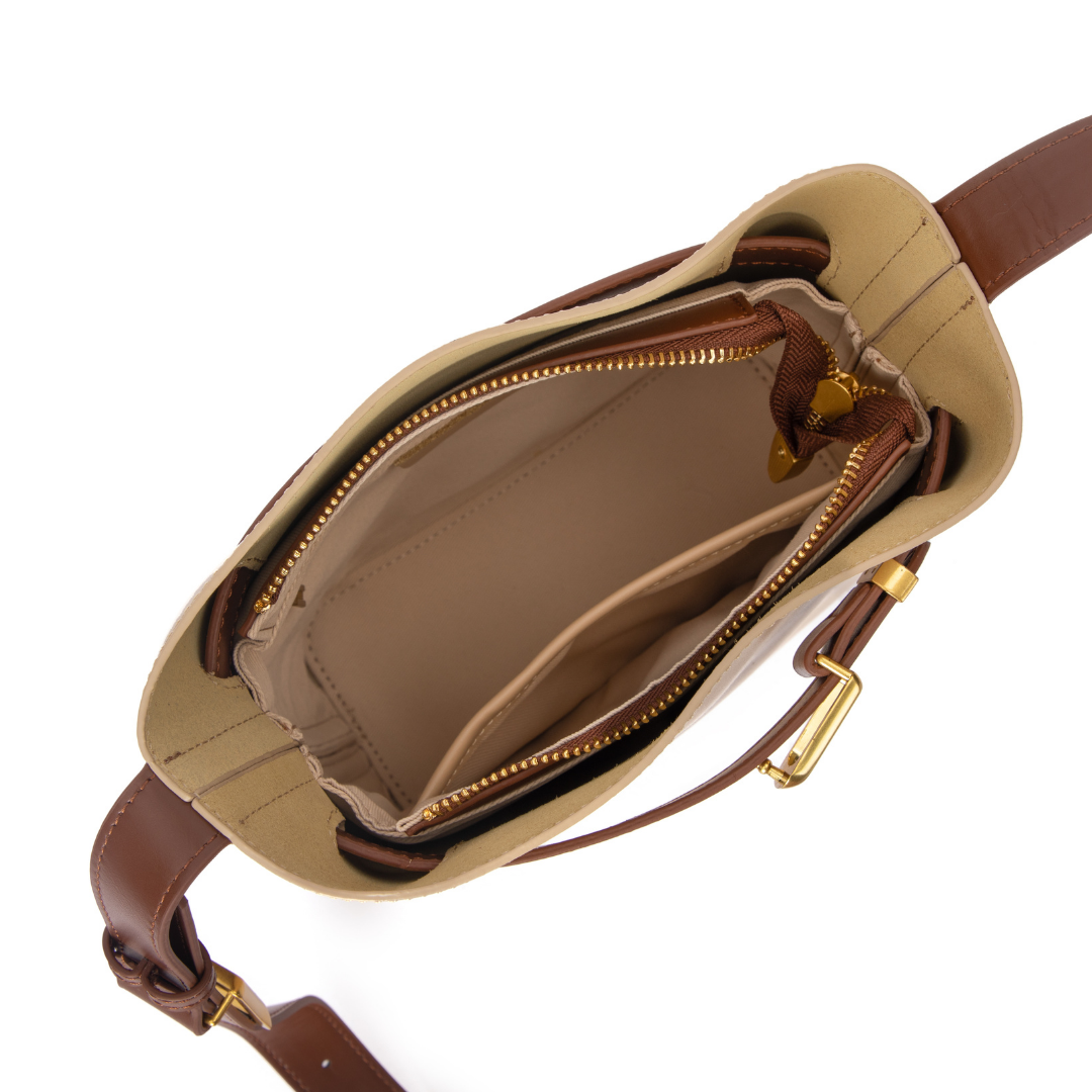 - Dual-Tone Aesthetic: Dark beige body contrasted with a chocolate brown belt and strap.