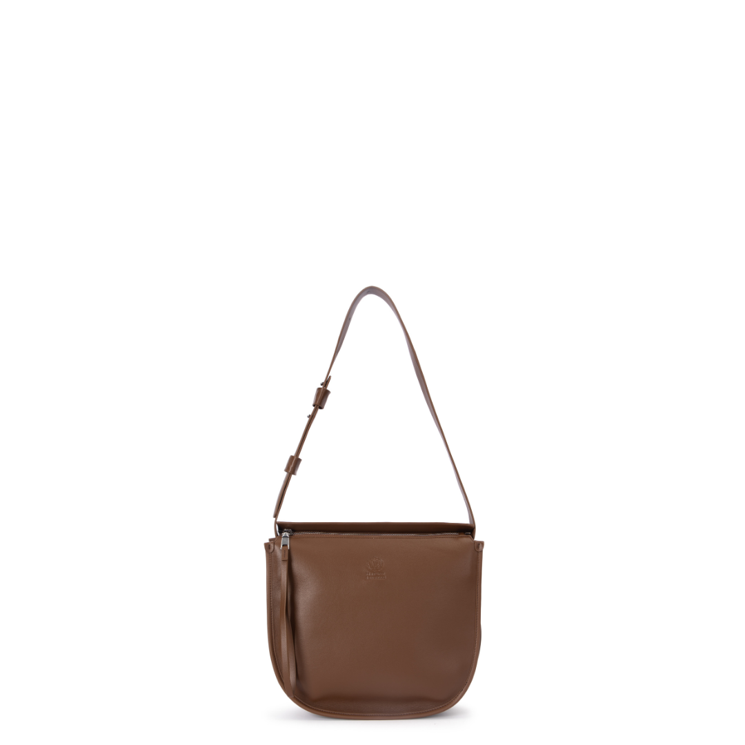 Move with warmth and intention. Le Soleil Fugitif features a graceful curved silhouette crafted from premium top-grain leather. Defined by elegant leather tassel accents and tonal stitching, this soft-structured shoulder bag is designed to mold perfectly to your movement, offering a spacious and sophisticated home for your daily essentials.
